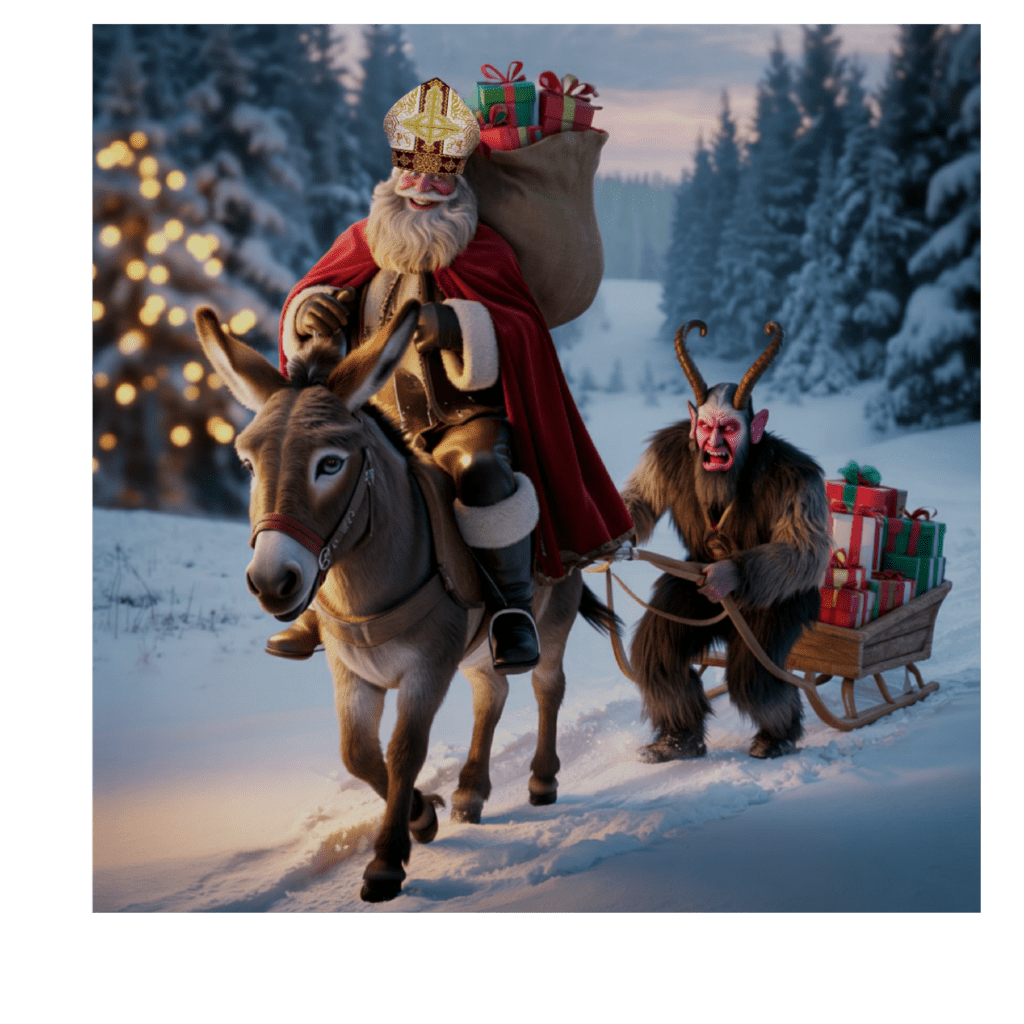 Die Geschichte von Nikolaus und Krampus beginnt mit vorchristlichen Ritualen, bei denen Gestalten wie der Krampus böse Geister vertrieben haben sollten. Durch die Christianisierung wurde der Krampus zum Begleiter des Heiligen Nikolaus, der die braven Kinder beschenkt und die unartigen mit dem Krampus bestraft. Die Tradition wird besonders in den Alpenländern wie Österreich, Bayern und Südtirol ausgeübt.